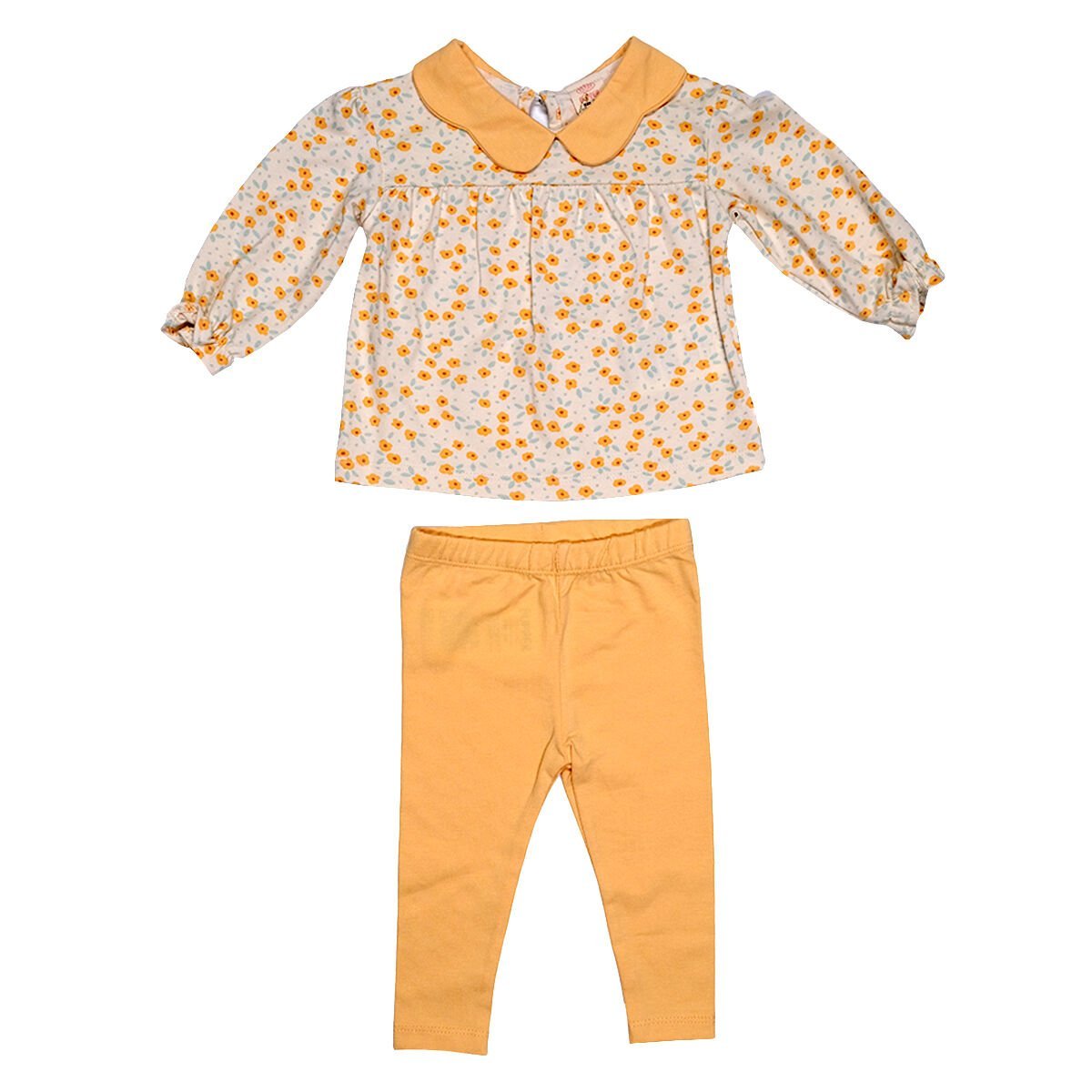 Açık renkli, narin çiçek baskılı uzun kollu üstü, kontrast renkteki geniş, yuvarlak yakasıyla dikkat çekiyor. Üstün yaka altındaki büzgü detayı tatlılık katıyor. Uyumlu renkteki, beli lastikli ve esnek tayt gibi setin tamamlayıcısı. Canlı renk uyumuyla yaz enerjisini yansıtıyor.