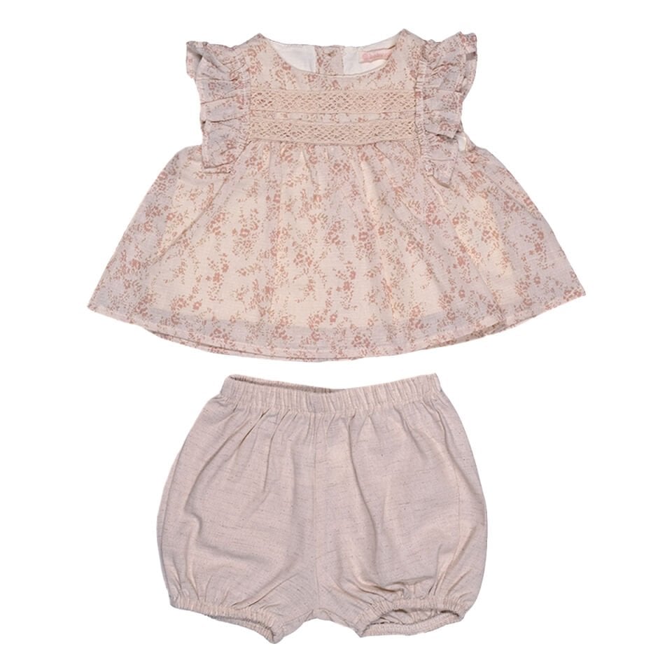 Üst kısmındaki dantel detayı ve fırfırlı kapak kollarıyla romantik bir görünüme sahip. Altındaki bol kesim, lastikli paçalı ve beli lastikli şort ise bebeğinizin özgürce hareket etmesine olanak tanır. Krem rengi ve narin tasarımıyla bebeğinizin tatlılığına tatlılık katacak.